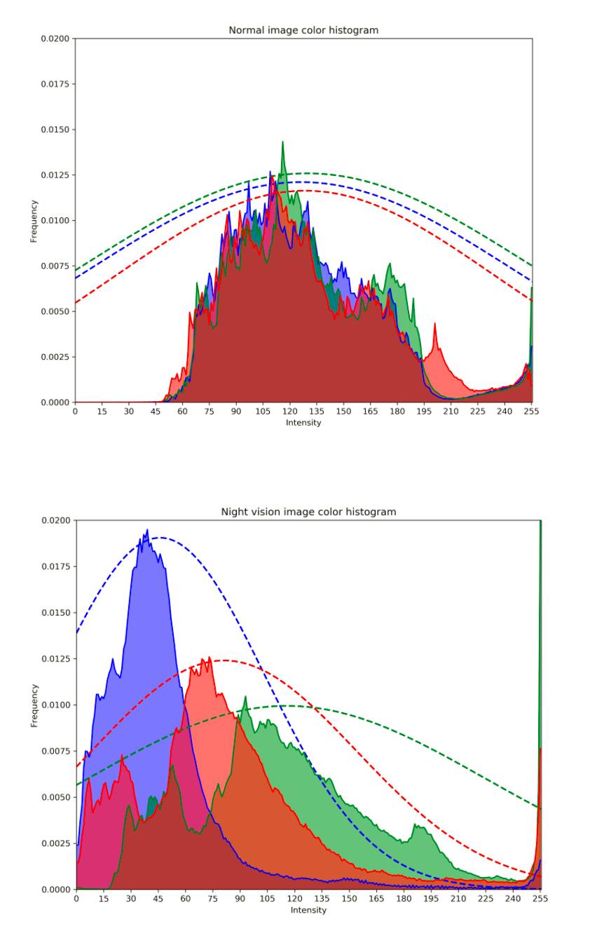 夜视图像真的很容易识别——只需检查绿色通道的平均值是否比红色和蓝色通道两者相加的均值更亮就行了,加权系数为 0.75,在所有情况下都适用。观察典型正常图像和夜视图像的颜色强度直方图,可以清楚地发现差异,因为常规图像的颜色分布通常彼此相近,这可以从下图中看出。虚线表示近似这些分布的最佳拟合高斯。