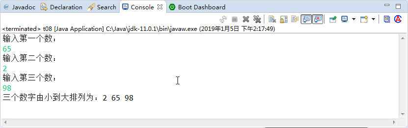 System.out.println("三个数字由小到大排列为:"+a+" "+b+" "+c);