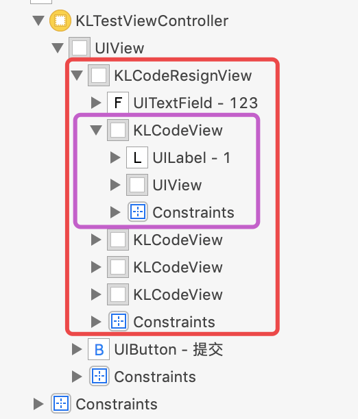 上图整个界面的布局很简单,就不多说了,重点就是中间这一块的验证码输入功能,我把它单独封装拿出来封装在一个自定义View(KLCodeResignView)里了,下图是KLCodeResignView布局的层次结构。