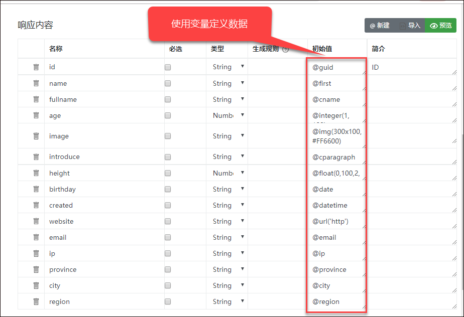 那么这些JSON数据是如何来的,我们其实是填写了一些变量,让它自动生成的数据的,这个也是Mock.js的功劳吧。RAP2集成了MockJS的很多变量使用,参考着使用就可以构建很多不一样的数据,非常方便。