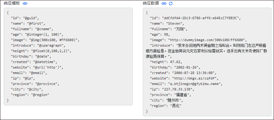 这个就是我们使用Mock变量的好处,自动根据规则填充,上面我使用了各种变量来定义数据,如果你需要了解Mock的变量,可以结合Mock的变量来测试即可。具体参考下面说明。