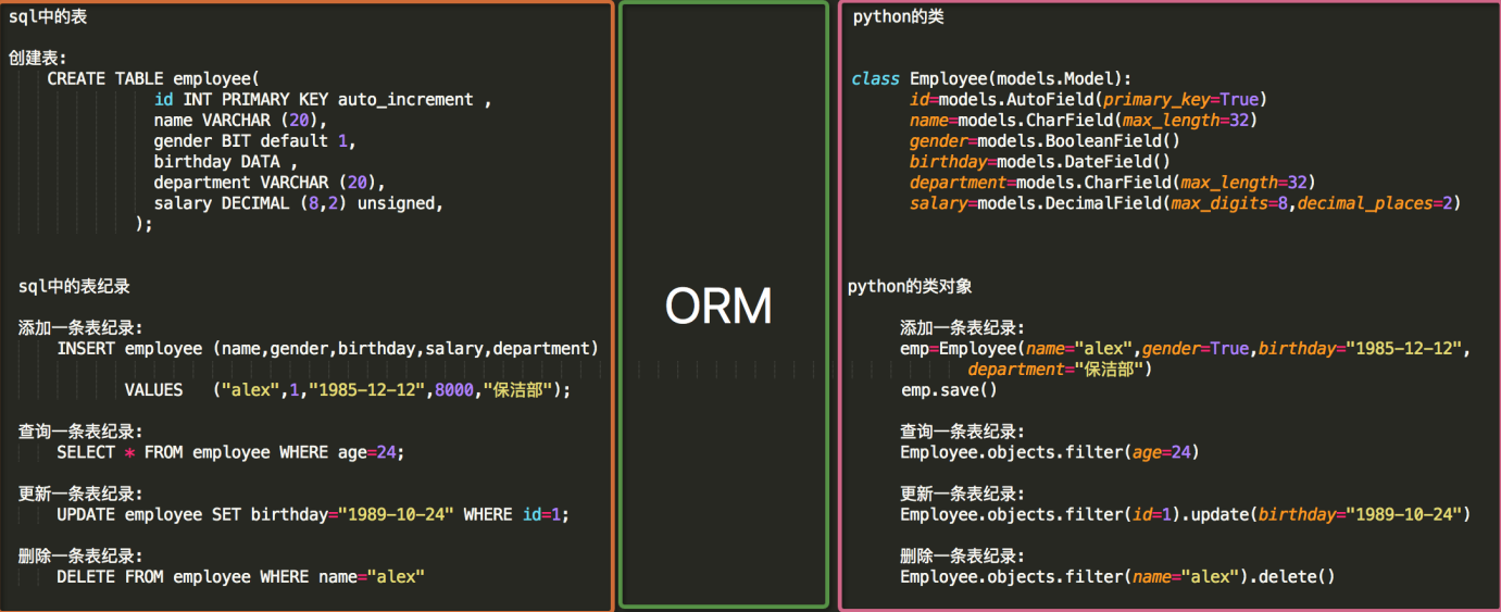DELETE FROM employee WHERE name="alex" #python的类class Employee(models.Model):