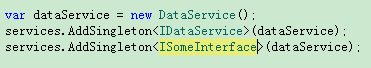 IServiceProvider provider = services.BuildServiceProvider(); IOtherService otherService = provider.GetRequiredService<IOtherService>();var dataService = new DataService(otherService); services.AddSingleton<IDataService>(dataService); services.AddSingleton<ISomeInterface>(dataService);