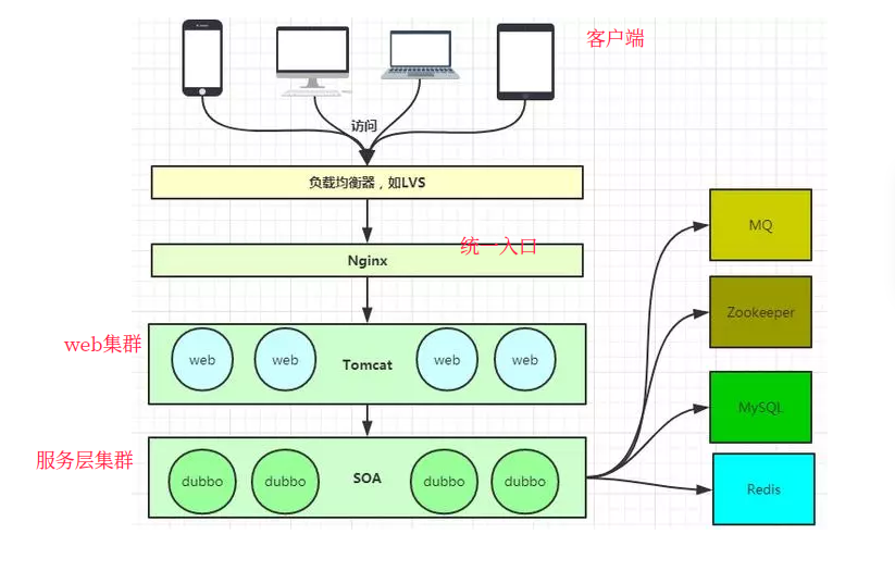 堡垒机做统一的代理转发,客户端(pc,移动端等)访问由nginx统一暴露的入口nginx反向代理,负载均衡到web服务器,由tomcat组成的集群,web层仅仅是作为接口请求的入口,没有实际的业务逻辑web层再用rpc远程调用注册到zookeeper的dubbo服务集群,dubbo服务与数据层交互,处理业务逻辑