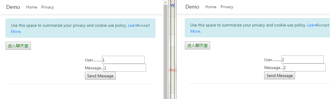 });//给"Send Message"按钮添加点击事件document.getElementById("sendButton").addEventListener("click", function (event) { var user = document.getElementById("userInput").value; var message = document.getElementById("messageInput").value; //调用服务端的 SendMessage 方法
