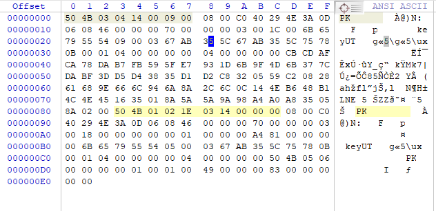 这里我以墨者学院的密码学加解密实训(Zip伪加密)为例,用winhex打开压缩包havekey.zip
