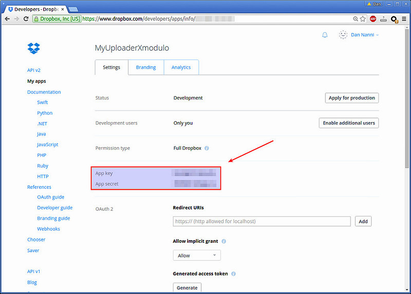 在你创建好一个新的 app 之后,你将在下一个页面看到 app key 和 app secret。请记住它们。