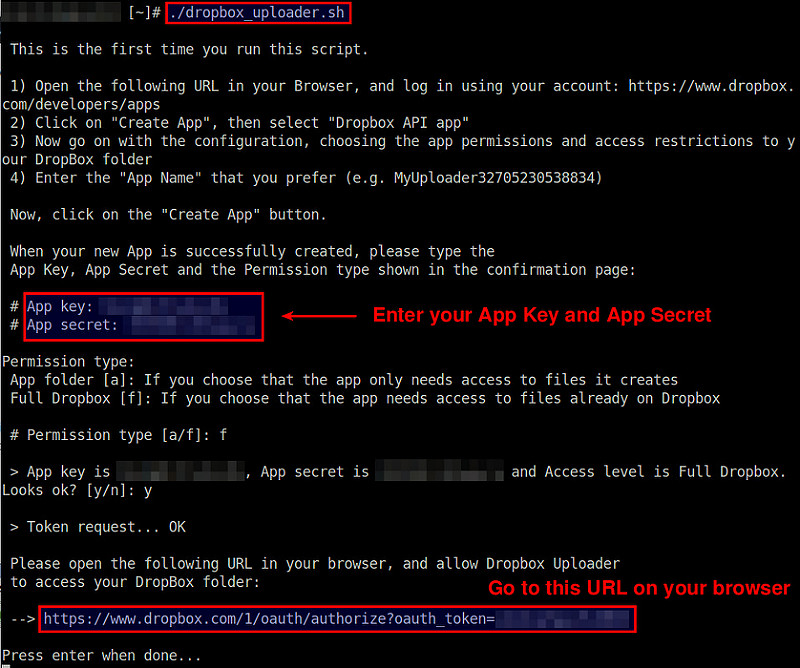然后在正运行着 dropbox_uploader.sh 的终端窗口中输入 app key 和 app secret。然后 dropbox_uploader.sh 将产生一个 oAUTH 网址(例如,https://www.dropbox.com/1/oauth/authorize?oauth_token=XXXXXXXXXXXX)。%E3%80%82)