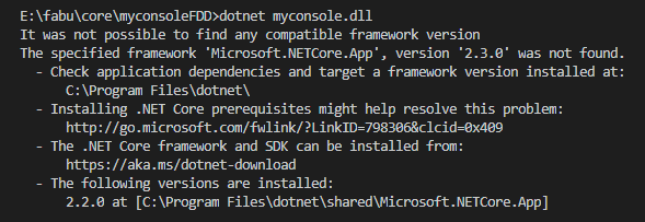第2句:没有找到指定的 2.3.0 版本的 framework "Microsoft .NETCore.App" .