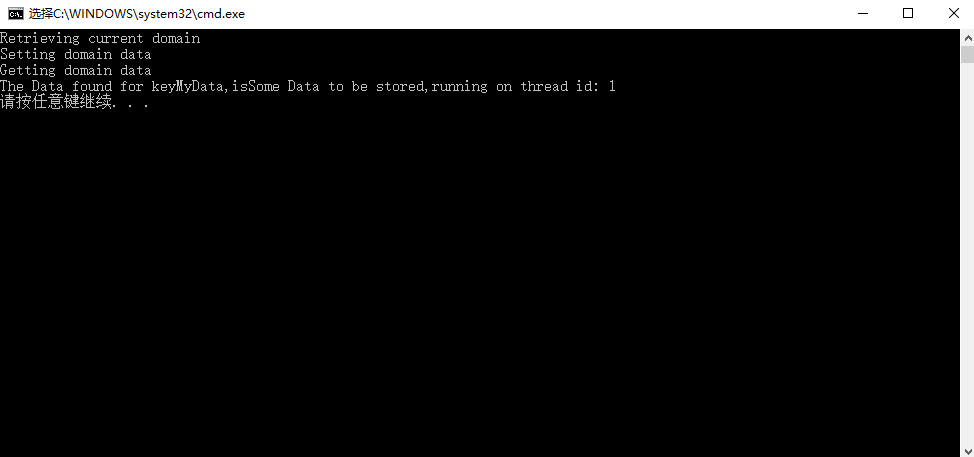 }这个方法非常简单,这里使用AppDomain类的GetData()方法,根据键值获取数据。把参数从GetDomainData方法传递给GetData,再把该方法的结果传递回调用方法。