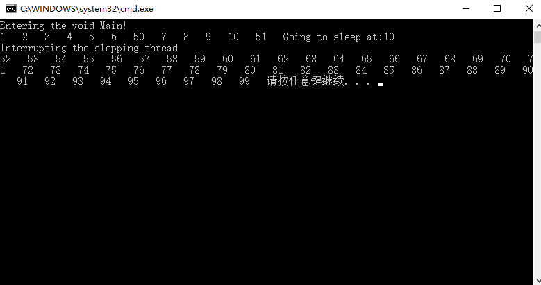 在上面的例子中,当计数器达到10、20 和30时,第一个线程(sleeper线程)进入睡眠状态。第二个线程(worker线程)检查第一个线程是否处于睡跟状态。如果是,就中断第一个线程,将其放回到调度队列中。Interrupt(方 法是将处于睡眠状态的线程重新激活的最好方法,如果等待资源的过程结束,且希望线程进入激活状态,就可以使用这项功能。