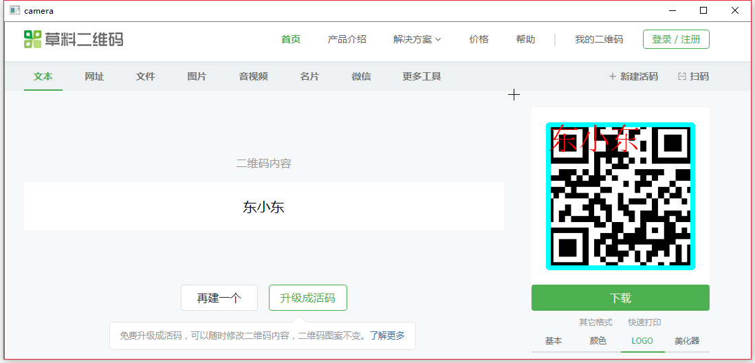 1 import pyzbar.pyzbar as pyzbar 2 from PIL import Image,ImageEnhance 3 4 image = "imgx\dongxiao.png" 5 6 img = Image.open(image) 7 #处理图片 8 #img = ImageEnhance.Brightness(img).enhance(2.0)#增加亮度 9 10 #img = ImageEnhance.Sharpness(img).enhance(17.0)#锐利化11 12 #img = ImageEnhance.Contrast(img).enhance(4.0)#增加对比度13 14 #img = img.convert('L')#灰度化15 16 #显示原图,调用系统默认的图片显示器17 img.show()18 19 texts = pyzbar.decode(img)20 #输出结果21 for text in texts:22 tt = text.data.decode("utf-8")23 print(tt)五、图识别进阶