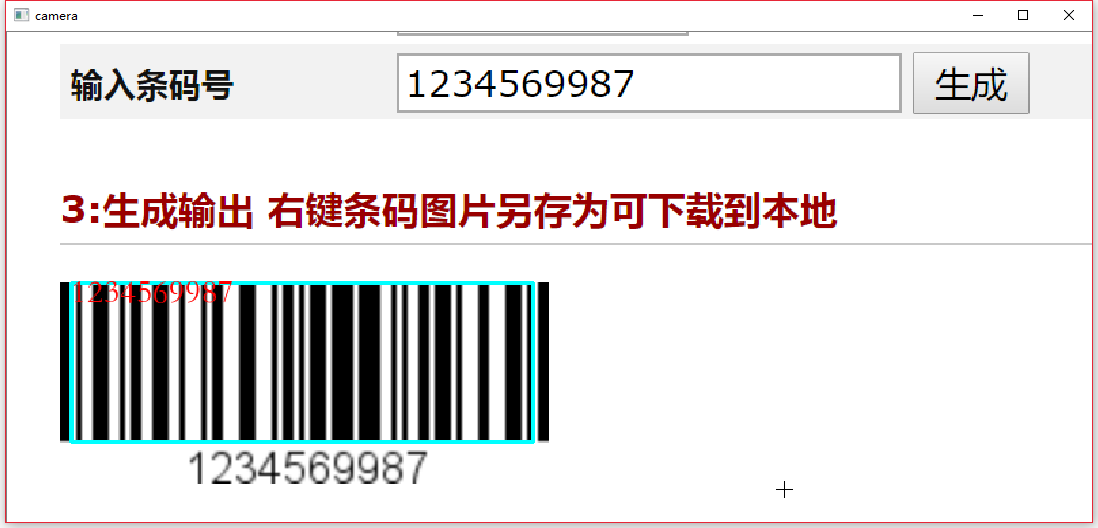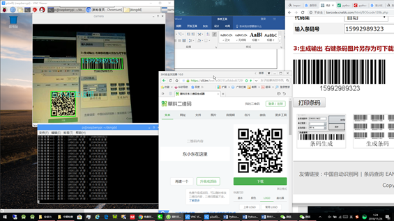 1 import cv2 2 import pyzbar.pyzbar as pyzbar 3 import numpy 4 from PIL import Image, ImageDraw, ImageFont 5 6 def decodeDisplay(imagex1): 7 # 转为灰度图像 8 gray = cv2.cvtColor(imagex1, cv2.COLOR_BGR2GRAY) 9 barcodes = pyzbar.decode(gray)10 11 for barcode in barcodes:12 13 # 提取条形码的边界框的位置14 # 画出图像中条形码的边界框15 (x, y, w, h) = barcode.rect16 cv2.rectangle(imagex1, (x, y), (x + w, y + h), (0, 255, 0), 2)17 18 # 条形码数据为字节对象,所以如果我们想在输出图像上19 # 画出来,就需要先将它转换成字符串20 barcodeData = barcode.data.decode("utf-8")21 barcodeType = barcode.type22 23 #不能显示中文24 # 绘出图像上条形码的数据和条形码类型25 #text = "{} ({})".format(barcodeData, barcodeType)26 #cv2.putText(imagex1, text, (x, y - 10), cv2.FONT_HERSHEY_SIMPLEX,5, (0, 0, 125), 2)27 28 29 #更换为:30 img_PIL = Image.fromarray(cv2.cvtColor(imagex1, cv2.COLOR_BGR2RGB))31 32 # 参数(字体,默认大小)33 font = ImageFont.truetype('fontx/hwst.ttf', 35)34 # 字体颜色(rgb)35 fillColor = (0,255,255)36 # 文字输出位置37 position = (x, y-10)38 # 输出内容39 str = barcodeData40 41 # 需要先把输出的中文字符转换成Unicode编码形式( str.decode("utf-8) )42 43 44 draw = ImageDraw.Draw(img_PIL)45 draw.text(position, str, font=font, fill=fillColor)46 # 使用PIL中的save方法保存图片到本地47 # img_PIL.save('02.jpg', 'jpeg')48 49 # 转换回OpenCV格式50 imagex1 = cv2.cvtColor(numpy.asarray(img_PIL), cv2.COLOR_RGB2BGR)51 52 53 # 向终端打印条形码数据和条形码类型54 print("扫描结果==》 类别: {0} 内容: {1}".format(barcodeType, barcodeData))55 cv2.imshow("camera", imagex1)56 57 58 def detect():59 cv2.namedWindow("camera",cv2.WINDOW_NORMAL)60 camera = cv2.VideoCapture(0)61 62 while True:63 # 读取当前帧64 ret, frame = camera.read()65 #print(ret.shape)66 decodeDisplay(frame)67 68 if(cv2.waitKey(5)==27):69 break70 camera.release()71 cv2.destroyAllWindows()72 73 74 if __name__ == '__main__':75 detect()
