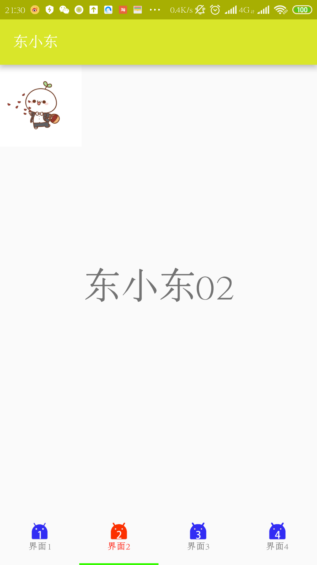 1 private ViewPager viewPager; 2 private TabLayout tabLayout; 3 //设置界面文件和文字一一对应 4 private Fragment[] Lfragments = {new Fragment0(), new Fragment1(), new Fragment2(),new Fragment3()}; 5 private String[] Ltitles = {"界面1", "界面2", "界面3","界面4"}; 6 //未选中图片 7 private int[] Limg = {R.mipmap.an1,R.mipmap.an2,R.mipmap.an3,R.mipmap.an4}; 8 //选中图片 9 private int[] Limgn = {R.mipmap.ann1,R.mipmap.ann2,R.mipmap.ann3,R.mipmap.ann4};10 //配置默认选中第几项11 private int ItemWhat=1;