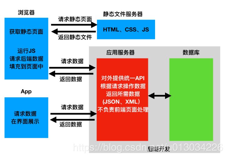 在传统的web应用开发中,大多数的工作人员会将浏览器作为前后端的分界线。将浏览器中为用户进行页面展示的部分称之为前端,而将运行在服务器,为前端提供业务逻辑和数据准备的所有代码统称为后端。