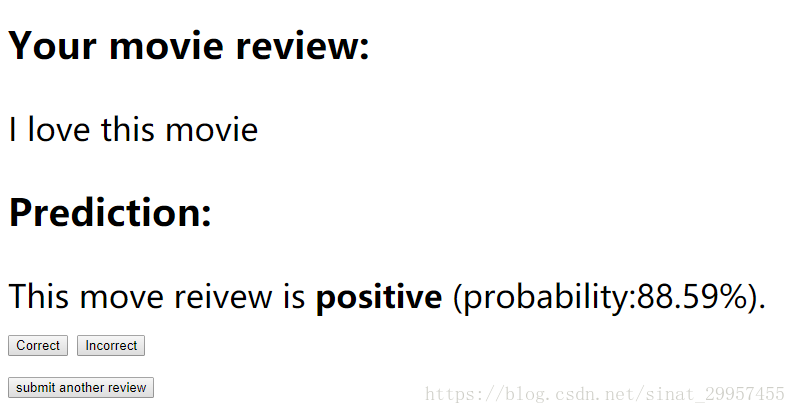 主要包括三个页面,评论提交页面、分类结果页面、感谢页面。当用户提交评论后跳转到结果页面,后台根据已有的模型来预测用户评论是属于正面评论还是负面评论,返回属于哪一种评论并且返回属于该种类的概率为多少。提供两个用户反馈结果按钮,如果用户点击正确按钮,则说明预测正确,否则预测错误,并将结果保存到SQLlite数据库中,然后再跳转到感谢页面。