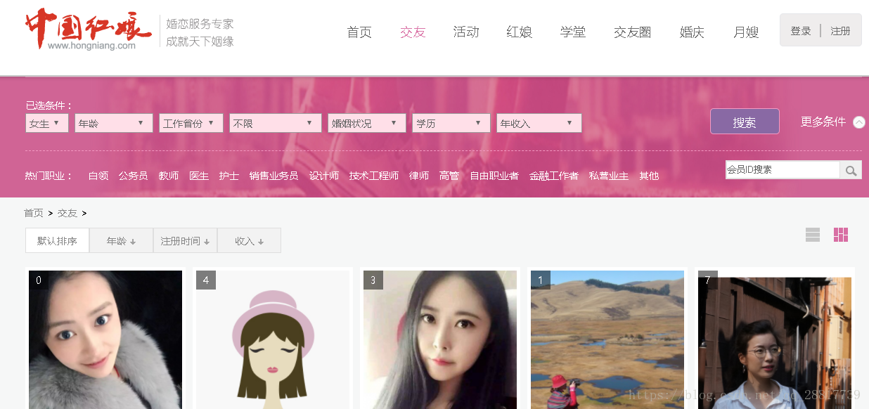 start_urls = ['http://www.hongniang.com/index/search?sort=0&wh=0&sex=2&starage=0&province=0&city=0&marriage=0&edu=0&income=0&height=0&pro=0&house=0&child=0&xz=0&sx=0&mz=0&hometownprovince=0']