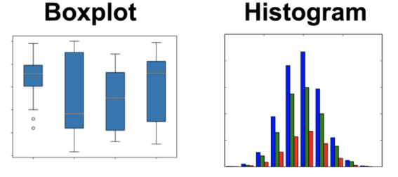 对于连续数据来说可以利用更为丰富的的手段进行处理,除了常见统计手段的均值和方差外还有峰峰值、范围等指标来进行表示。为了表示数据的误差和离散程度,带有误差棒的箱式图和直方图不失为一种直观的呈现方式。通过箱图可以看到数据的集中程度和误差程度,而直方图则可以提供数据的整体形态、中值、分布以及趋势。