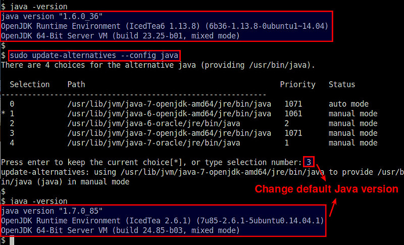 首先,试用下面的update-alternatives命令检查你系统上可用的Java版本:
