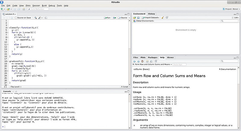 就让我们以或许是最为人们喜爱的 R IDE —— RStudio 来开始我们的介绍吧。除了一般 IDE 所提供的诸如语法高亮、代码补全等功能,RStudio 还因其集成了 R 语言帮助文档、强大的调试器、多视图系统而突出。如果你准备入门 R 语言,我只建议你将 RStudio 作为你的 R 语言控制台,一方面用它来实时测试代码是很完美的,另外对象浏览器可以帮助你理解你正在处理的是哪类数据。最后,真正征服我的是它集成了图形显示器,使得你能够更轻松地将图形输出为图片文件。至于它不好的方面, RStudio 缺乏快捷键和高级设置来使得它成为一个完美的 IDE。然而,它有一个以 AGPL 协议发布的免费版本, Linux 用户没有借口不去试试这个 IDE。