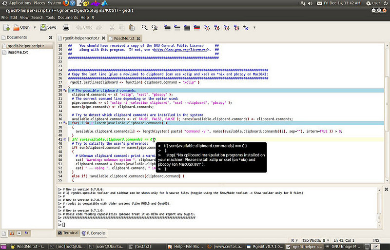 若 Emacs 和 Vim 都不是你的菜,而你恰好喜欢默认的 Gnome 编辑器,则 RGedit 就是专门为你而生的:它是 Gedit 的一个专门编辑 R 代码的插件。Gedit 比你以为的更强大,配上大量的插件,就有可能用它来做许许多多的事情。而 RGedit 恰好就是你编辑 R 代码所需要的那款插件。它支持传统的语法高亮并在屏幕下方集成了 R 控制台,但它还有一大类独特的功能,例如多文件编辑、代码折叠、文件查看器,甚至还有一个 GUI 的向导用来从 snippets 产生代码。尽管我对 Gedit 并不感冒,但我必须承认这些功能比一般插件的功能更好,并且在你花费很长时间去分析数据时它会有很大的帮助。唯一的不足是它的最后一次更新是 2013 年。我真的希望这个项目能够被重新焕发新生。