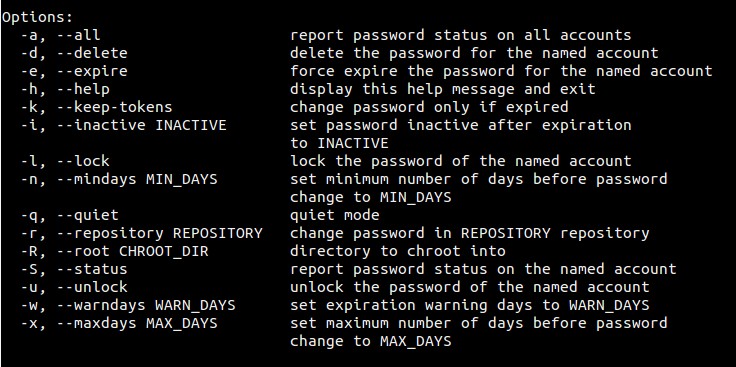 # passwd {options} {user_name}可以在 passwd 命令使用不同的选项,列表如下: