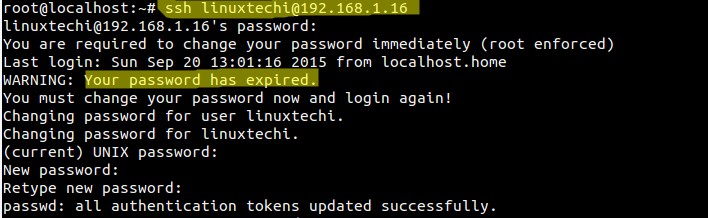 [root@linuxworld ~]# passwd -e linuxtechi Expiring password for user linuxtechi. passwd: Success [root@linuxworld ~]# passwd -S linuxtechi linuxtechi PS 1970-01-01 0 99999 7 -1 (Password set, SHA512 crypt.) [root@linuxworld ~]#