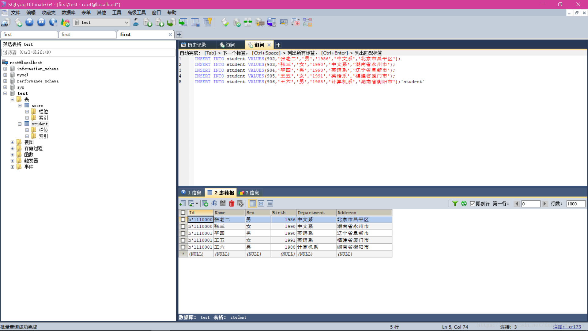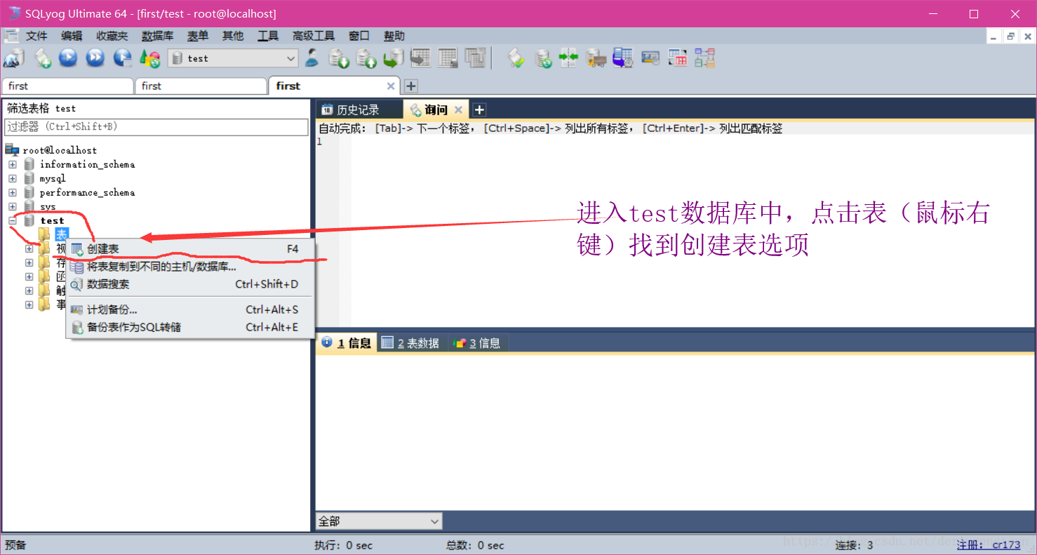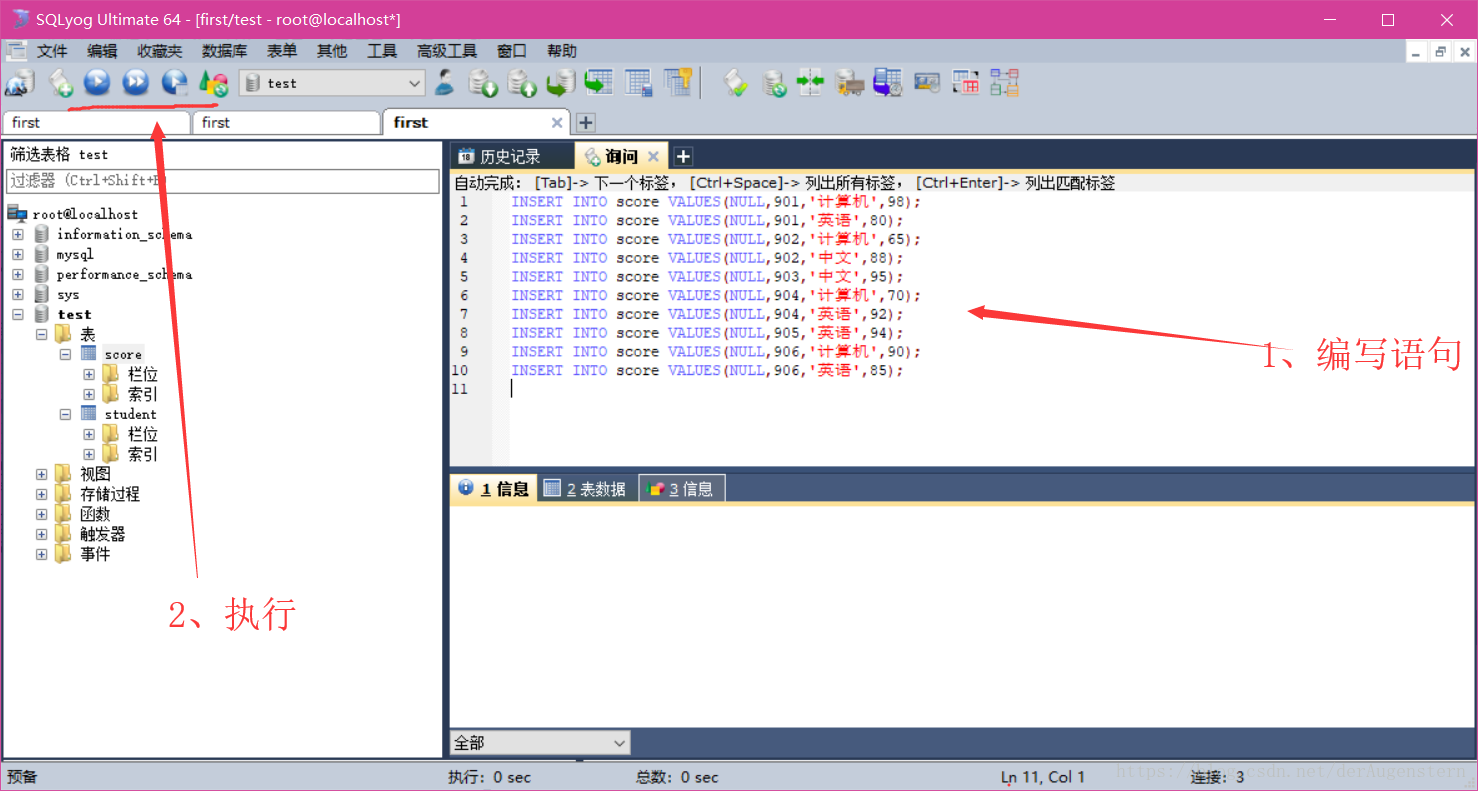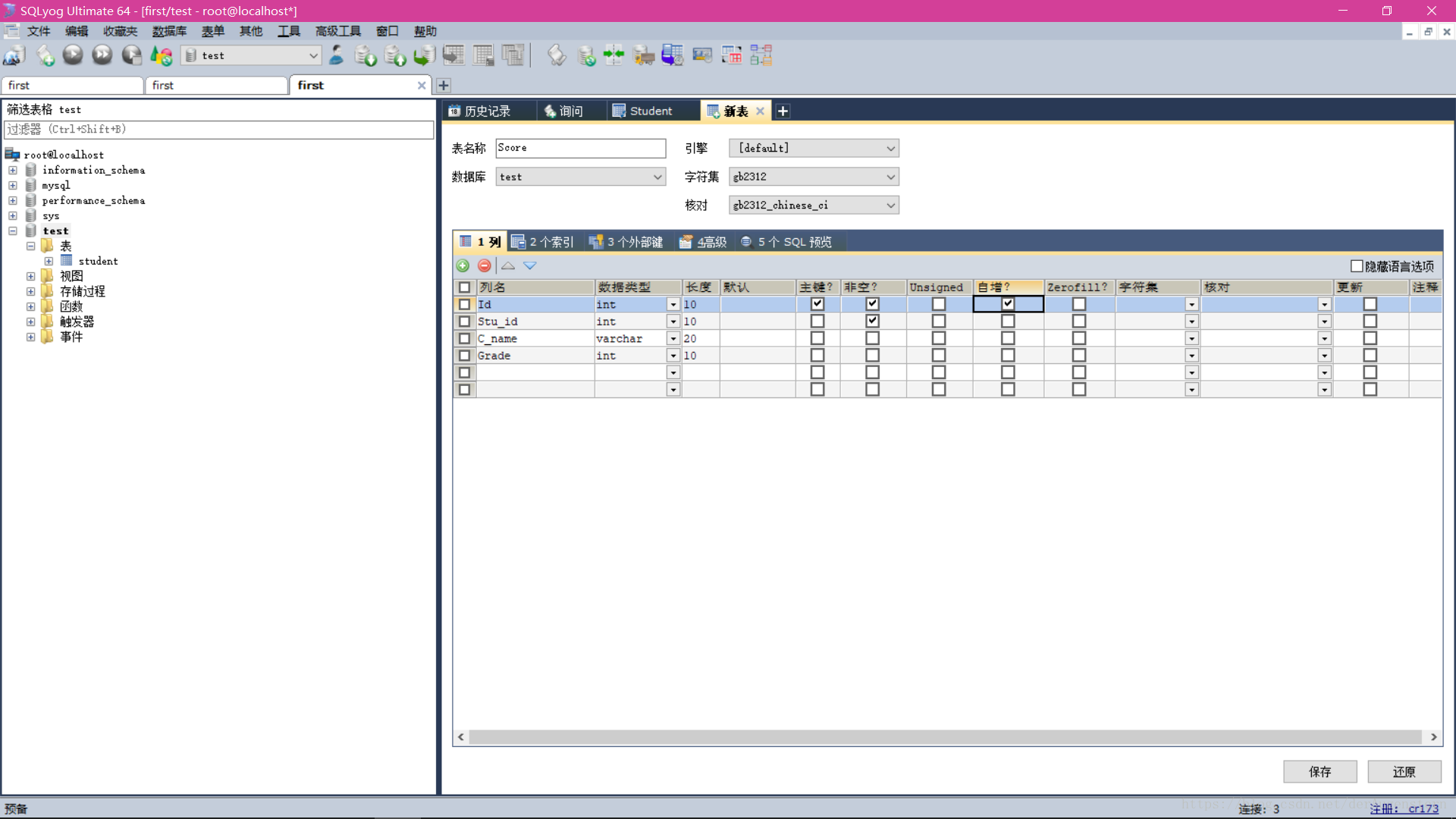 1、由上面的语句中,我们可以得知需要建立student表和score表。首先我们在SQLyog的test数据库中建立两个表: