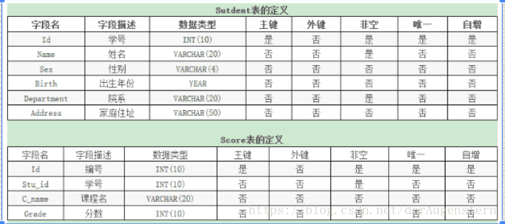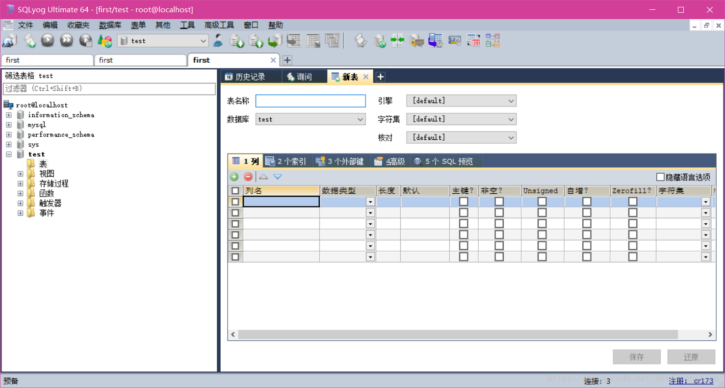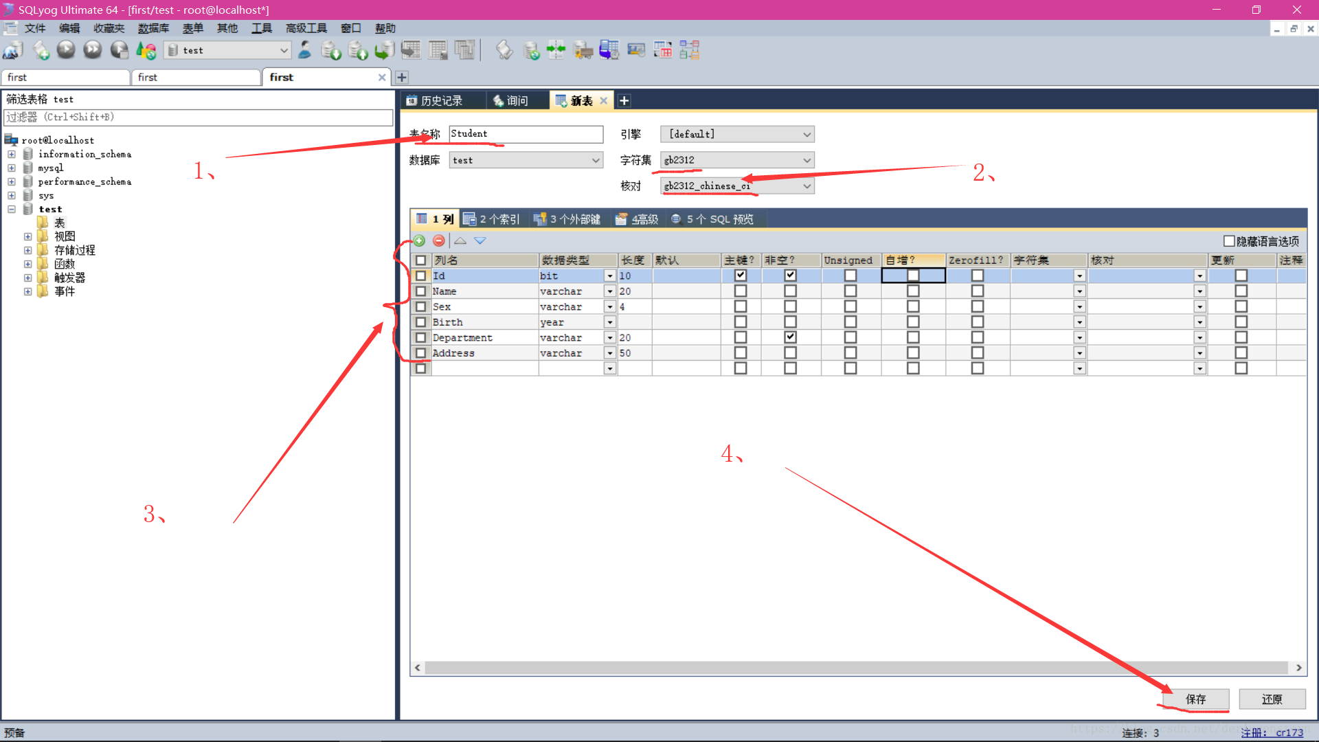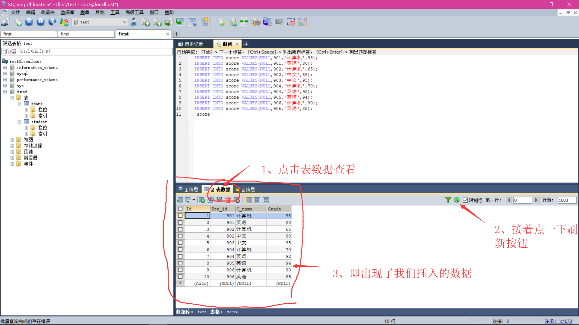 1、由上面的语句中,我们可以得知需要建立student表和score表。首先我们在SQLyog的test数据库中建立两个表: