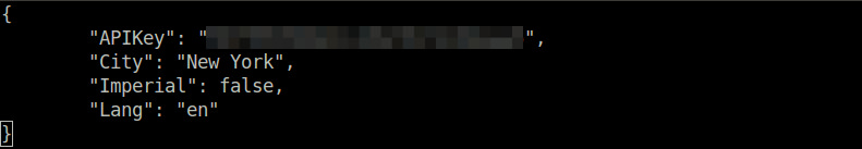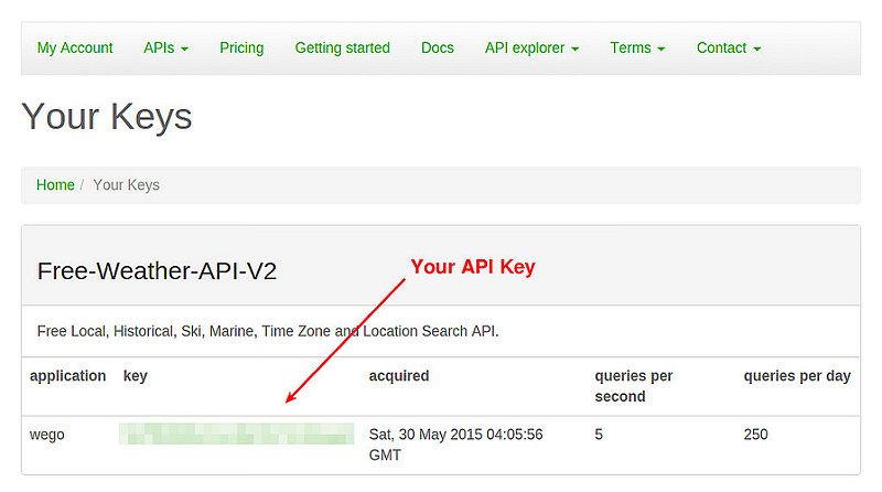 第一次运行 weg 会生成一个配置文件(~/.wegorc),你需要指定一个天气 API key。 你可以从 worldweatheronline.com 获取一个免费的 API key。免费注册和使用。你只需要提供一个有效的邮箱地址。
