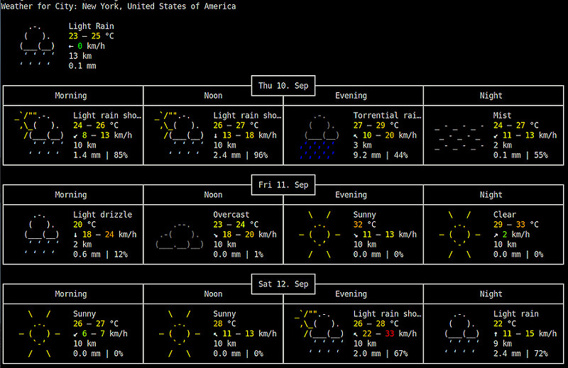 除了 API key,你还可以把你想要查询天气的地方、使用的城市/国家名称、语言配置在 ~/.wegorc 中。 注意,这个天气 API 的使用有限制:每秒最多 5 次查询,每天最多 250 次查询。 当你重新执行 wego 命令,你将会看到最新的天气预报(当然是你的指定地方),如下显示。