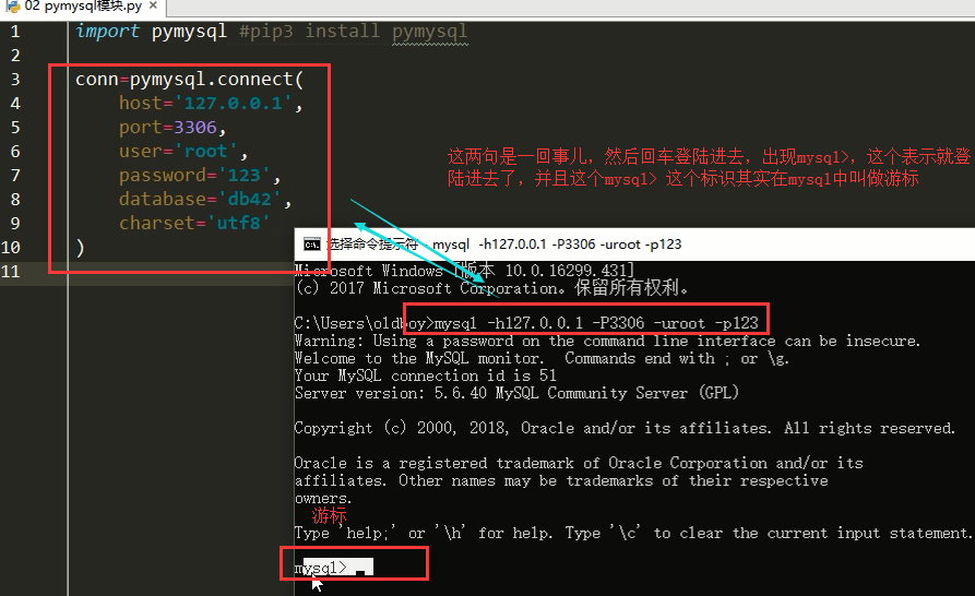 #指定编码为utf8的时候,注意没有-,别写utf-8,数据库为#得到conn这个连接对象#游标cursor=conn.cursor() #这就想到于mysql自带的那个客户端的游标mysql> 在这后面输入指令,回车执行#cursor=conn.cursor(cursor=pymysql.cursors.DictCursor) #获取字典数据类型表示的结果:{'sid': 1, 'gender': '男', 'class_id': 1, 'sname': '理解'} {'字段名':值}