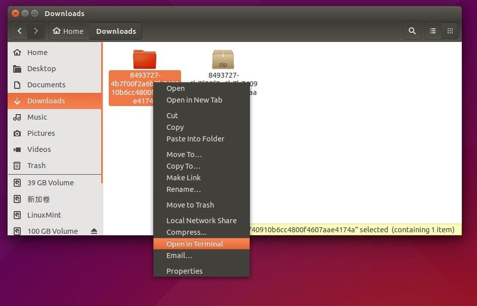 右键点击解压后的文件夹,选择 “在终端中打开” 到此文件夹下。