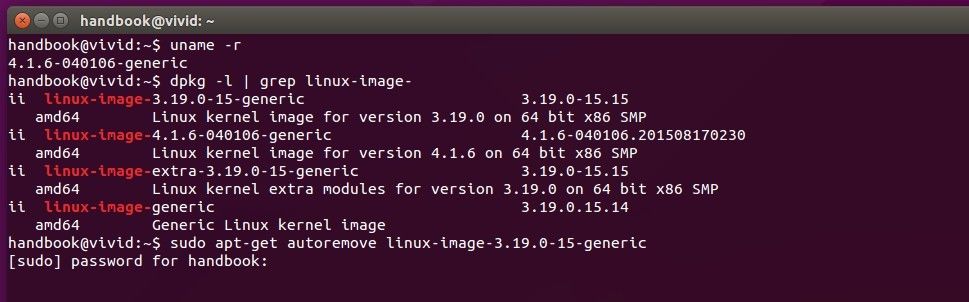 uname -r dpkg -l | grep linux-image- sudo apt-get autoremove KERNEL_IMAGE_NAME