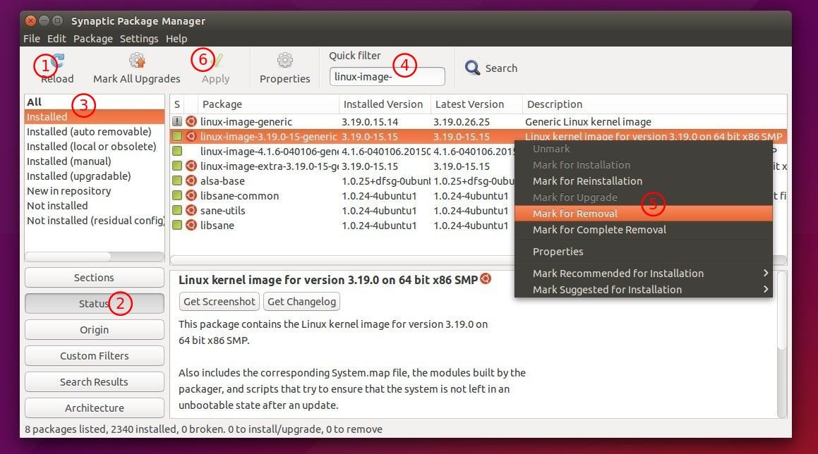 选择一个内核镜像 “linux-image-x.xx.xx-generic” 然后将其标记为removal(或者Complete Removal)