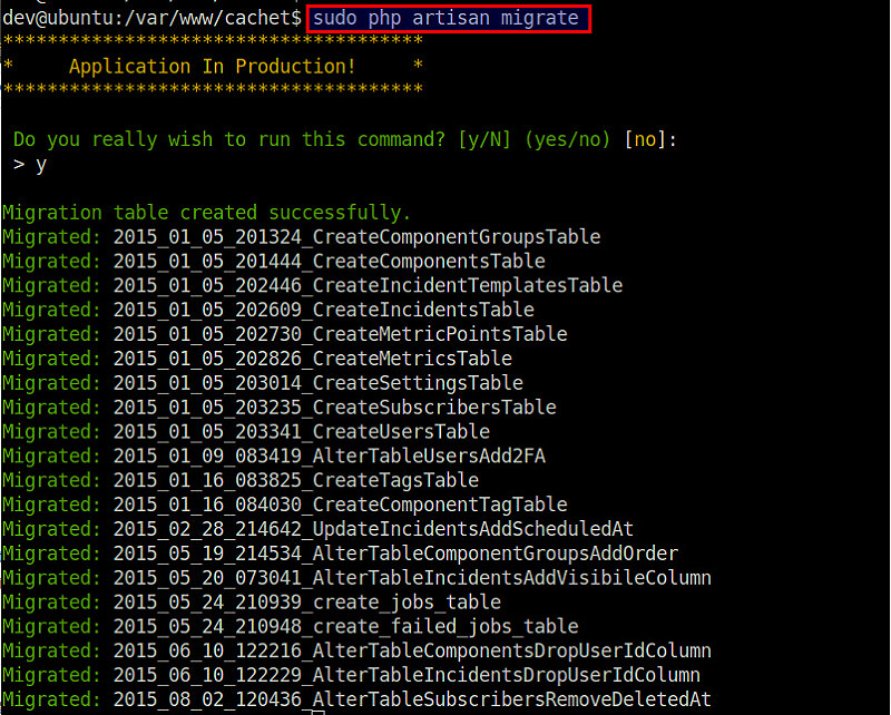 假设在 /var/www/cachet/.env 的数据库配置无误,数据库迁移应该像下面显示一样成功完成。