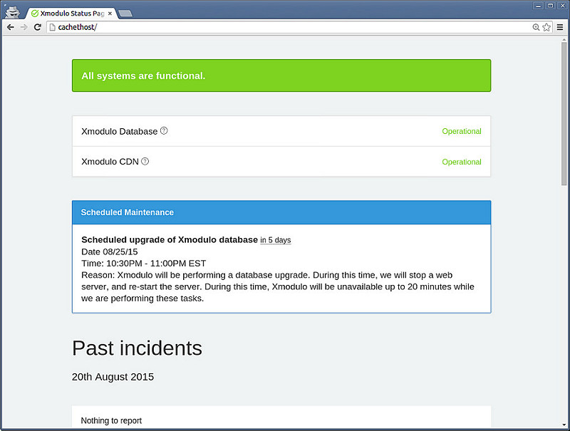 最后一句,我喜欢提及一个事。用 Cachet 设置一个漂亮的状态页面是很简单的,但要将这个软件用好并不像安装它那么容易。你需要完全保障所有 IT 团队习惯准确及时的更新状态页,从而建立公共信息的准确性。同时,你需要教用户去查看状态页面。最后,如果没有很好的填充数据,部署状态页面就没有意义,并且/或者没有一个人查看它。记住这个,尤其是当你考虑在你的工作环境中部署 Cachet 时。