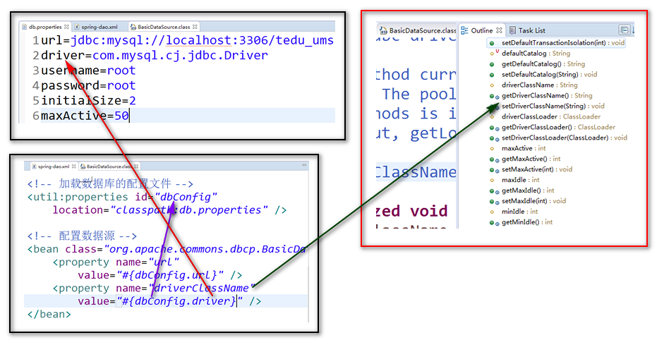 然后,将以上读取到的配置值应用于数据源`BasicDataSource`中: