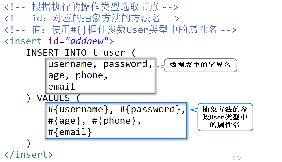 然后,在`UserMapper.xml`映射文件中添加新的节点配置抽象方法对应的SQL语句:
