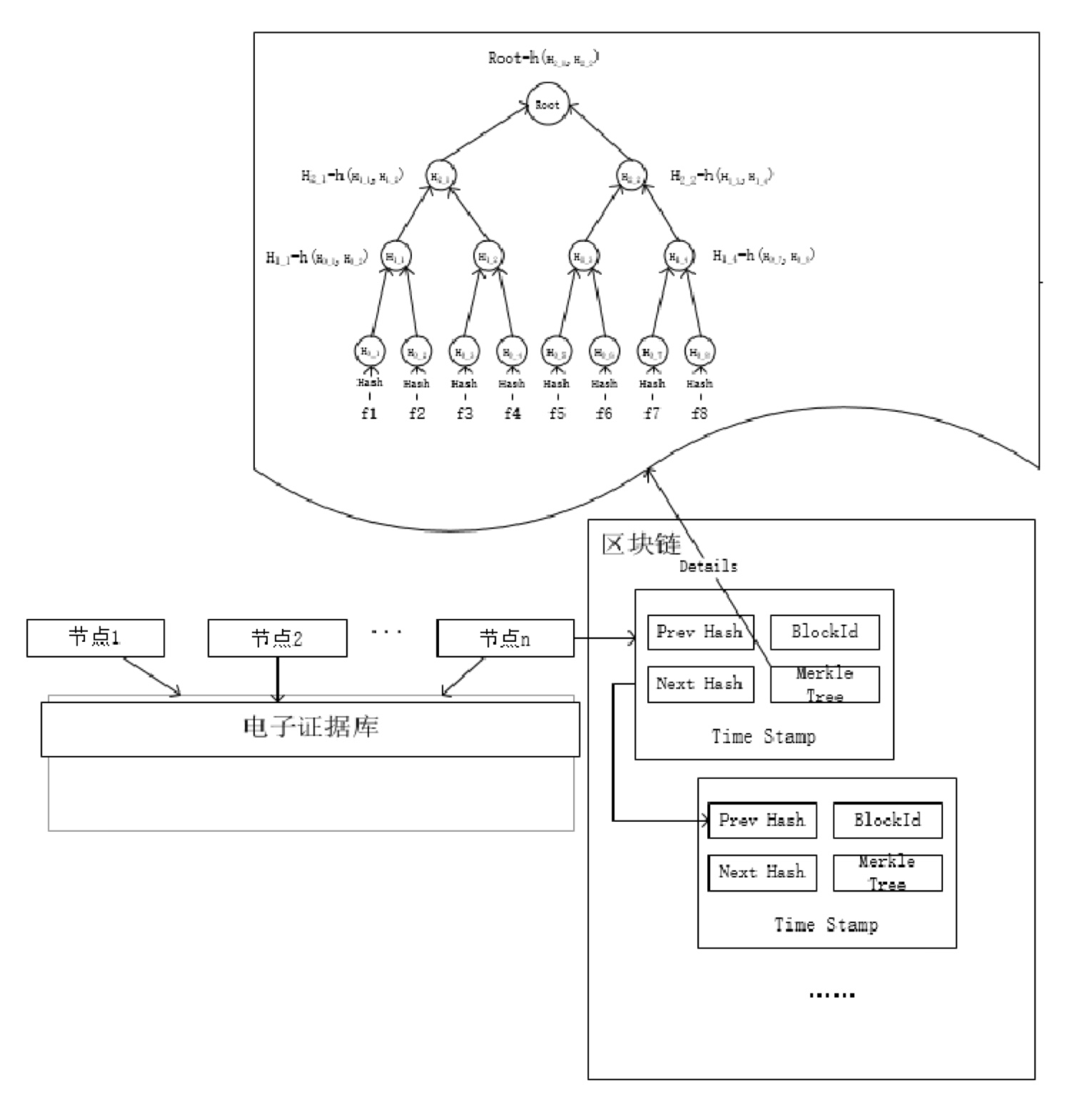 由图1所示,本系统的核心是由 n 个节点组成的 P2P 网络,每个节点各自维护相同的证据链,即区块链中的证据信息。在此结构中,区块链相当于一种点对点的分布式数据库,存储各用户的保全信息,它以一种改进的共识算法来保障节点间保全数据的一致性,并以加密算法及电子签名技术保障了用户数据的安全性和隐私性,同时通过时间戳技术、Merkle Tree 算法及区块