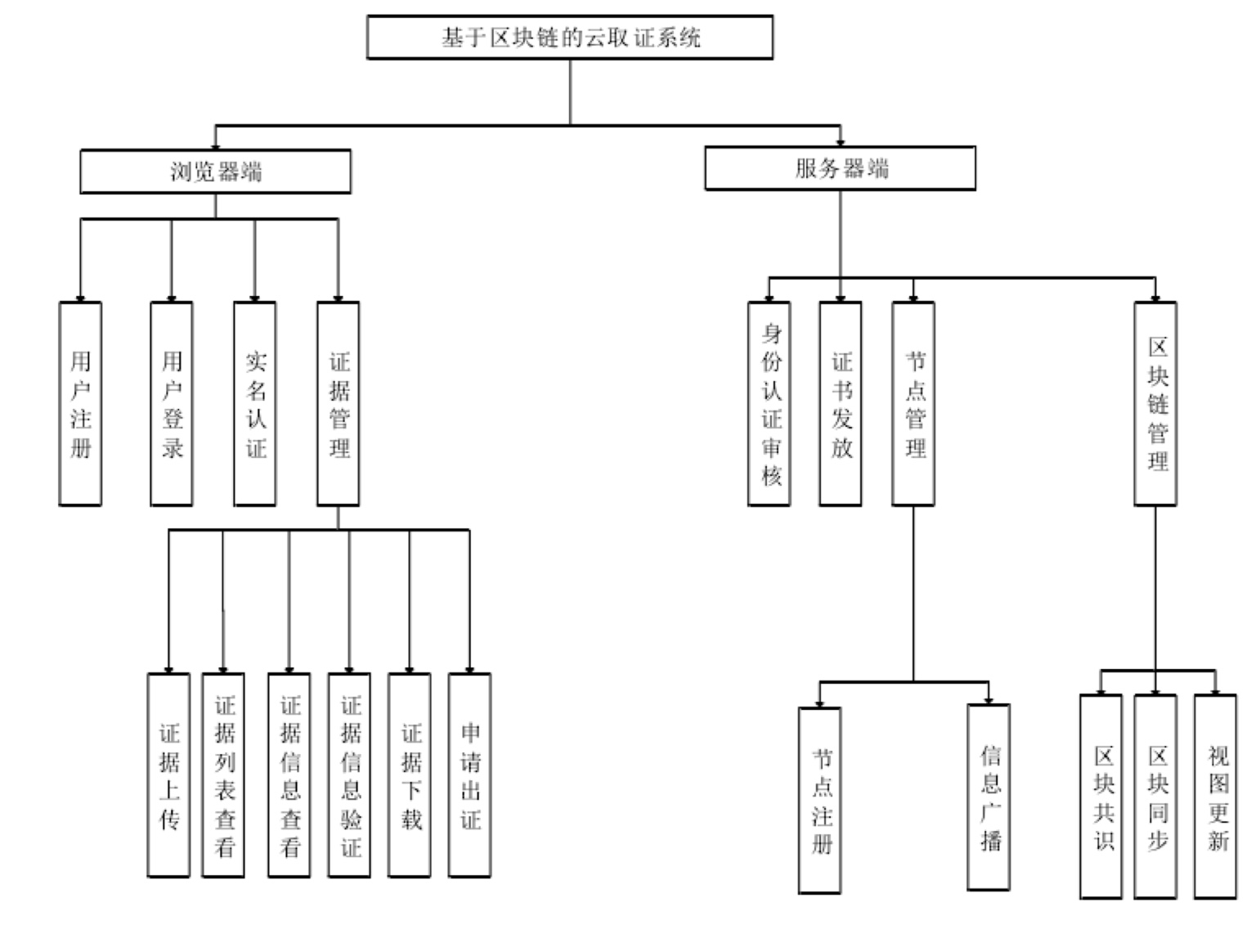 系统14 个功能模块来完成,浏览器端主要功能为:用户注册、用户登录、实名认证、证据上传、证据列表查看、证据信息查看、证据信息验证、证据下载、申请出证等;服务器端主要功能