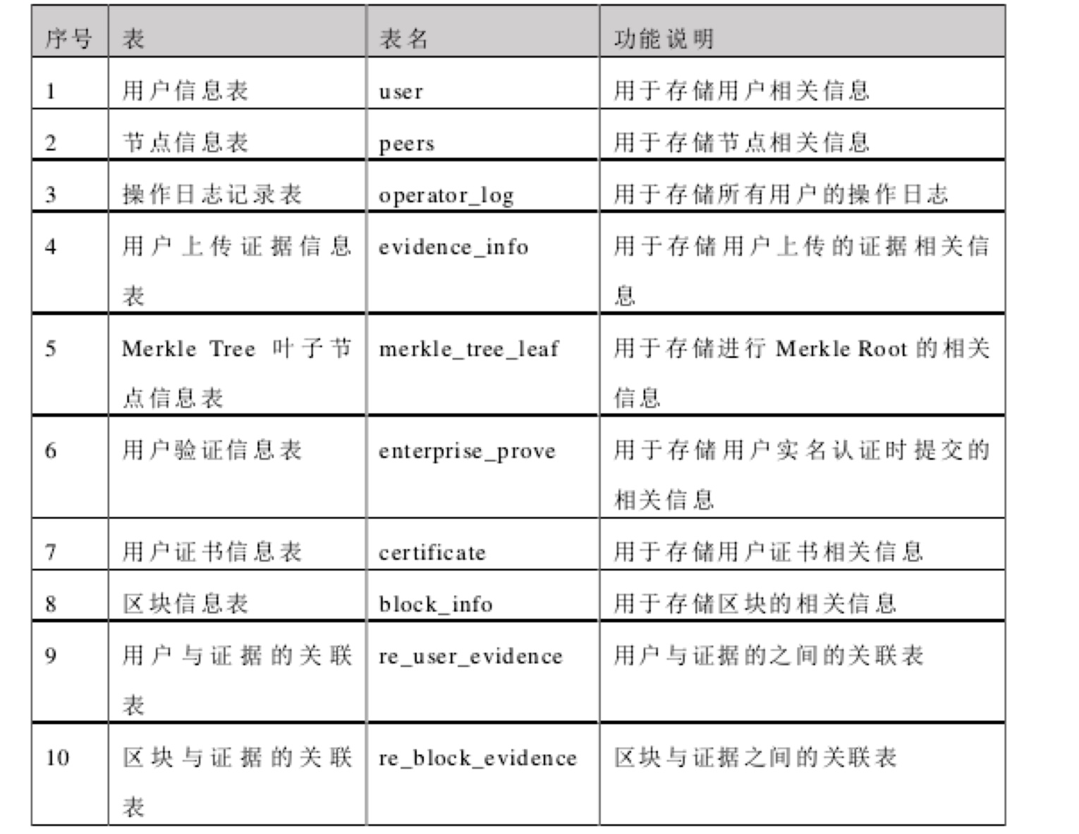 证书信息表、区块信息表、用户与证据的关联表、区块与证据的关联表。数