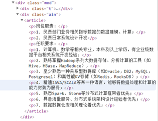 所以我决定将每一行信息都转化为数组的一个元素,再通过上下文信息与其自身的词汇信息判断其归属。在我爬取的51job移动端中,岗位信息的条目都在标签<article>下,因此使用//text()方法,将<article>标签下每一行的信息都转化为一个数组元素。