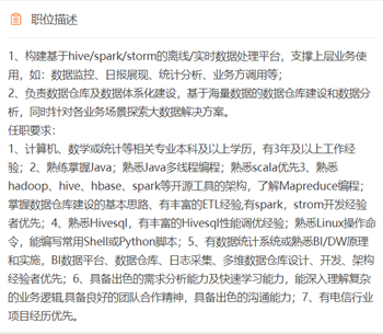 上图所示的数据格式是最完美的,只需要正则表达式就能匹配成功。每一条数据都含有信息,'岗位职责'与'岗位要求'预示下文的数据与这个主题相关,其余信息则属于某一个主题。所以对这类结构化非常明显的信息,只需要匹配出'职责'与'要求'即可完成数据的分离。