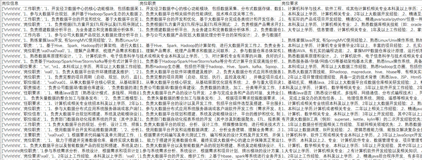 在之前写的爬虫里,岗位信息一栏使用Xpath的String()方法抓取,作为一个大的字符串,所有信息都位于一个单元格中。现在计划在爬虫运行时,得到岗位信息后就将其分离,再写入硬盘中。所以,爬取数据时的格式会极大的影响分离的方法,字符串适合使用正则表达式,但是在格式混乱的岗位信息中,这显然不是完美的解法,如'岗位职责',与之类似的还有'工作内容','职位描述'等等,这些词的各种排列组合会极大的增加正则表达式的长度。