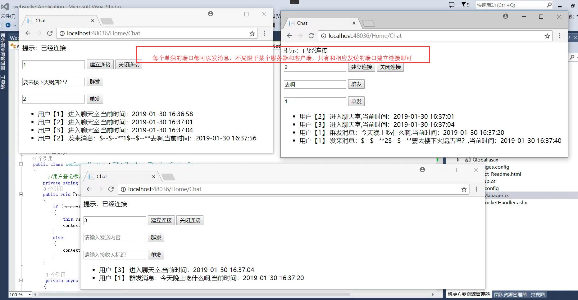 代码主要分为3部分组成:前端html页面、服务器端ashx一般处理程序、封装的消息发送帮助类。