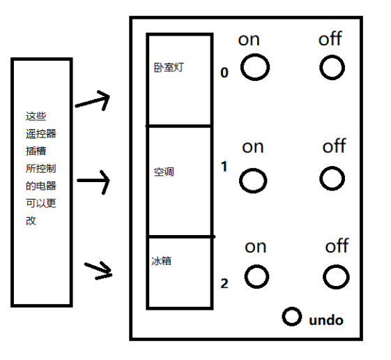 这个遥控器有三个插槽(编号为0,1,2),每个插槽对应着要操作的一个电器,插槽所控制的电器这里设置的分别是卧室灯、空调、冰箱,这些电器是可以换成其他的电器的。每个插槽分别对应一个打开按钮和一个关闭按钮(on和off)用于打开和关闭相应的电器,另外还有一个撤销按钮(undo)用于撤销上一步所进行的操作(如果我按下0号位上的on按钮,那么电灯将会打开,再按下undo按钮,电灯就会熄灭)。基于这个条件来给遥控器进行编程。