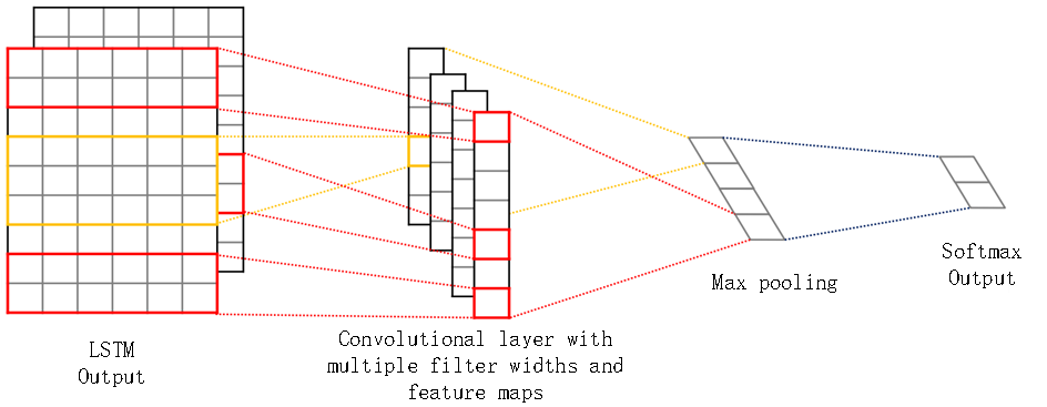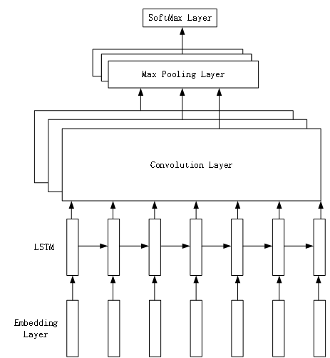 首先通过Embedding Layer将单词转化为词向量,再输入LSTM进行语义特征提取,由于原始语料处理时进行了padding的操作,所以在LSTM输出时乘以MASK矩阵来减小padding所带来的影响。下一步将LSTM的输出作为CNN的输入,进行进一步的特征提取。最后得到分类结果。