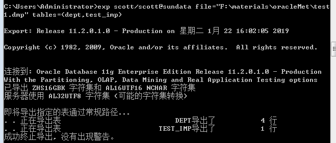 exp scott/scott@sundata file="F:\materials\oracleMet\test1.dmp" tables=(dept,test_imp)