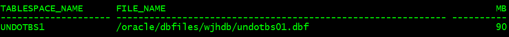 set lines 200 pages 200col file_name for a60 col tablespace_name for a20;select tablespace_name,file_name,bytes/1024/1024 MB from dba_data_fileswhere tablespace_name like '%UNDOTBS%';
